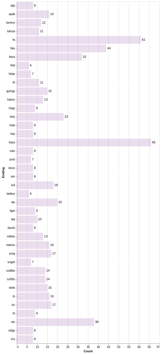 Az alábbi ábrán azt szemléltettük, hogyan alakul a top 40 utónév eloszlása. Könnyen leolvashatjuk a diagramról, hogy a -háza a leggyakoribb 66 előfordulással, amelyet a -fa és a -falu követ.